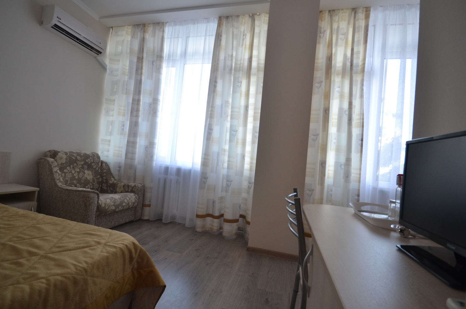 Площадь номера - 12 кв.м. 1 осн. место. 1 доп. место. Мебель: зеркало, кровать односпальная, прикроватная тумбочка, стол, стул, шкаф. Оборудование: сплит-система, телевизор, холодильник. Санузел. Сервис: смена полотенец (1 раз в 5 дней), смена постельного белья (1 раз в 5 дней), уборка номера (ежедневно).