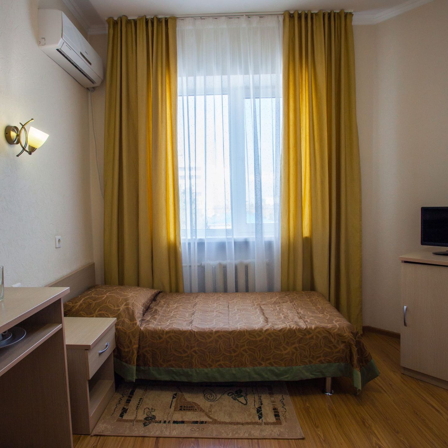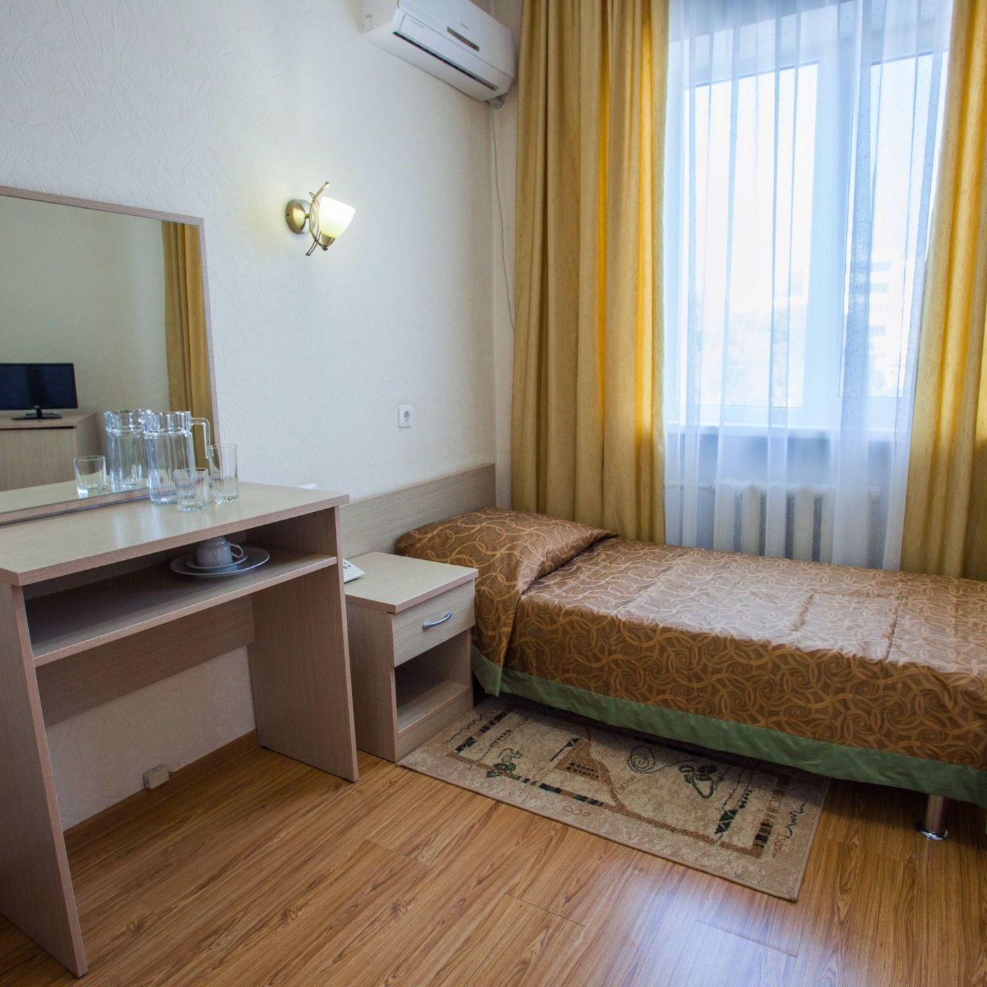 Площадь номера - 8 кв.м. 1 осн. место. Мебель: зеркало, кровать односпальная, прикроватная тумбочка, столик журнальный, стул, шкаф. Оборудование: сплит-система, телевизор, холодильник. Санузел. Сервис: смена полотенец (1 раз в 5 дней), смена постельного белья (1 раз в 5 дней), уборка номера (ежедневно).