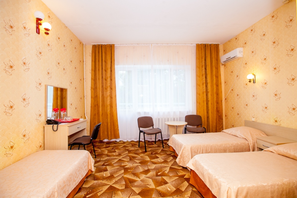 Площадь номера - 18 кв.м. 3 осн. места. Мебель: зеркало, кровати односпальные (3), прикроватные тумбочки, стол, стулья, шкаф. Оборудование: сплит-система, телевизор, холодильник, электрочайник. Санузел. Сервис: смена полотенец (1 раз в 5 дней), смена постельного белья (1 раз в 5 дней), уборка номера (ежедневно).